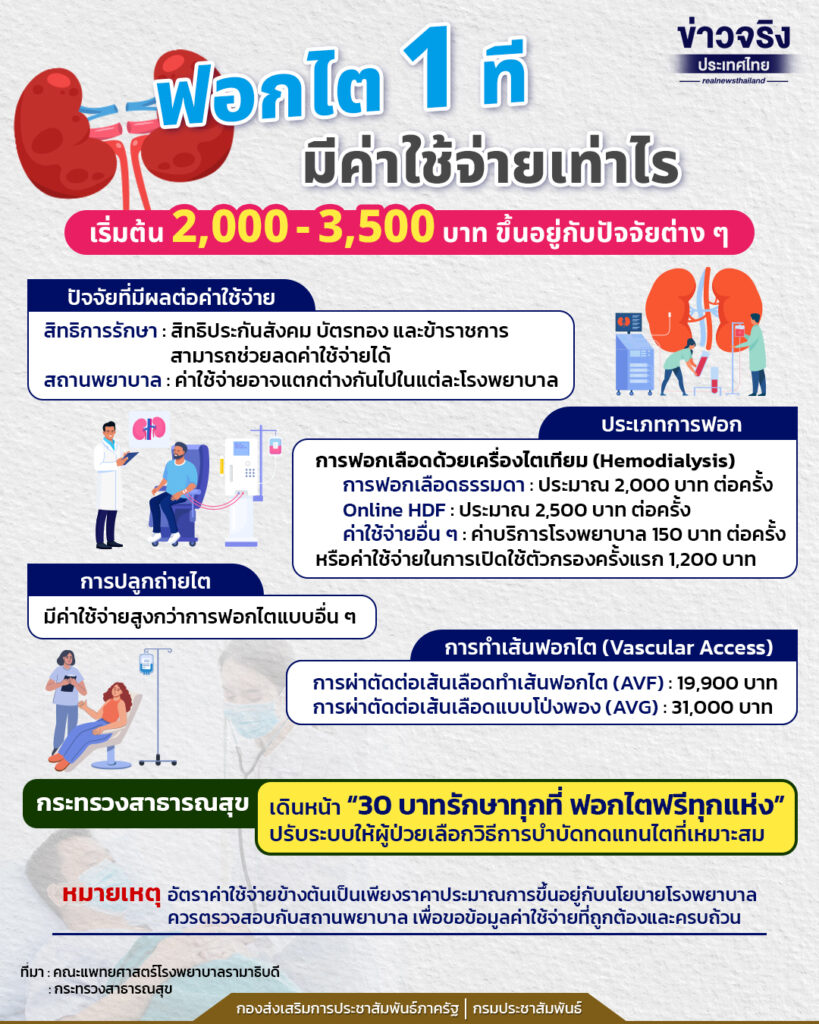 ซึ่งค่าใช้จ่ายในการฟอกไตนั้น เริ่มต้นที่ประมาณ 2,000 – 3,500 บาท ขึ้นอยู่กับปัจจัยต่าง ๆ ทั้งสิทธิการรักษา สถานพยาบาล และประเภทการฟอกไต