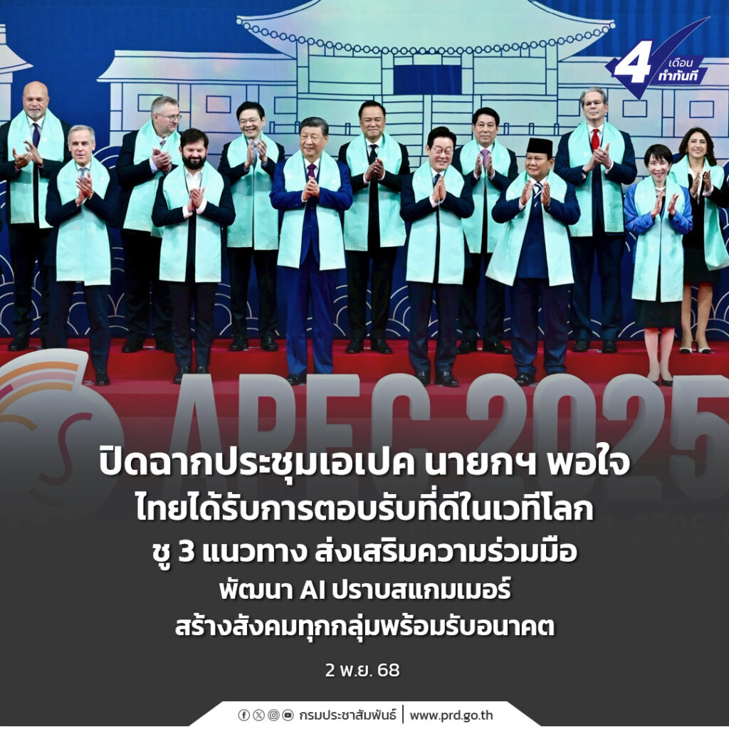 โดยนายกรัฐมนตรี ให้สัมภาษณ์ว่า พอใจภาพรวมตลอด 4 วันที่ผ่านมา (29 ต.ค. – 1 พ.ย. 68) ทั้งการหารือกับภาคเอกชนชั้นนำ สภาที่ปรึกษาทางธุรกิจเอเปค และการหารือทวิภาคีกับผู้นำหลายประเทศ จีน แคนาดา บรูไน และการพูดคุยกับนายโดนัลด์ เจ ทรัมป์ ประธานาธิบดีแห่งสหรัฐอเมริกา ซึ่งบรรยากาศโดยรวมเป็นไปอย่างฉันท์มิตร ทำให้การพูดคุยความร่วมมือต่าง ๆ มีสัญญาณที่ดี ทั้งการค้า การลงทุน การปราบปรามสแกมเมอร์ การท่องเที่ยว พลังงานสะอาด เศรษฐกิจดิจิทัล ตลอดจนการเชื่อมโยงระหว่างประชาชนกับประชาชน ซึ่งเป็นการสะท้อนให้เห็นว่า ไทยได้รับการตอบรับที่ดีในเวทีโลก