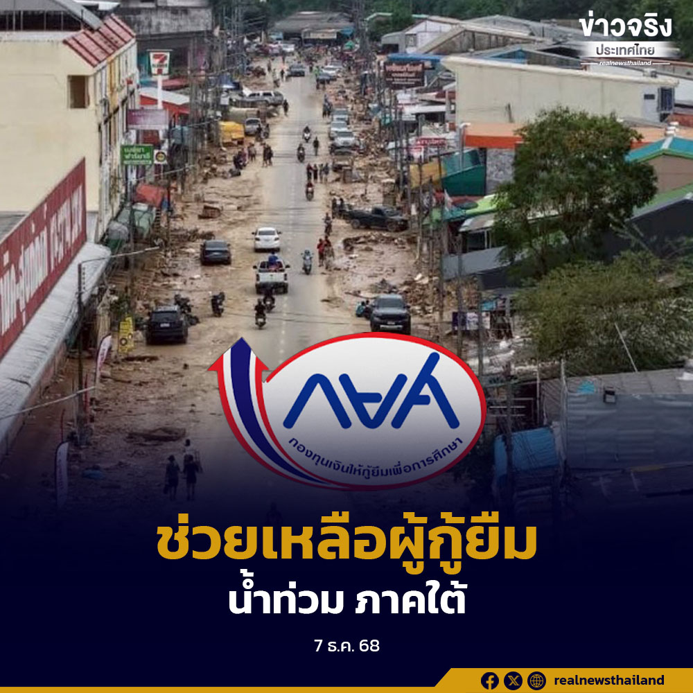 นางสาวอัยรินทร์ พันธุ์ฤทธิ์ รองโฆษกประจำสำนักนายกรัฐมนตรี เปิดเผยว่า จากสถานการณ์อุทกภัยในพื้นที่ภาคใต้ ส่งผลให้ประชาชนได้รับความเดือดร้อนและทรัพย์สินได้รับความเสียหาย ซึ่งในพื้นที่ดังกล่าวมีผู้กู้ยืมที่อยู่ระหว่างการชำระหนี้จำนวนประมาณ 500,000 ราย กองทุนเงินให้กู้ยืมเพื่อการศึกษา หรือ กยศ. มีแนวทางให้ความช่วยเหลือ กรณีเป็นผู้กู้ยืมที่ไม่ผิดนัดชำระหนี้ ตามสัญญากู้ยืมเงิน (15 ปี) ขอผ่อนผันการชำระหนี้สูงสุด 2 ปี สามารถผ่อนผันได้ครั้งละไม่เกิน 1 ปี โดยระหว่างช่วงเวลาที่ได้รับการผ่อนผัน ผู้กู้ยืมไม่ต้องชำระหนี้เงินต้นและดอกเบี้ย และจะไม่มีการคิดค่าปรับหรือค่าธรรมเนียมกรณีผิดนัดชำระหนี้ที่เกิดขึ้นในระหว่างเวลาที่ได้รับการผ่อนผัน