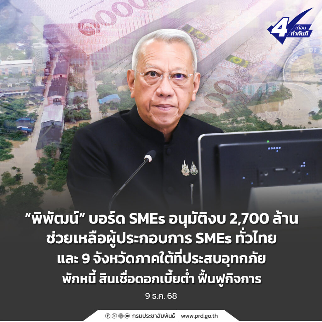 นายพิพัฒน์ กล่าวว่า ที่ประชุมมีมติเห็นชอบในหลักการมาตรการเร่งด่วนเพื่อช่วยเหลือผู้ประกอบการ SMEs ทั่วไทย และใน 9 จังหวัดภาคใต้ที่ประสบอุทกภัยครั้งใหญ่ ได้แก่ จังหวัดสงขลา ปัตตานี ยะลา นราธิวาส พัทลุง ตรัง สตูล นครศรีธรรมราช และสุราษฎร์ธานี โดยข้อมูลจากสำนักงานส่งเสริมวิสาหกิจขนาดกลางและขนาดย่อม ชี้ว่า เหตุการณ์ครั้งนี้ทำให้ผู้ประกอบการกว่า 200,000 ราย ได้รับผลกระทบ และกระทบต่อการจ้างงานกว่า 900,000 คน จึงจำเป็นต้องออกมาตรการแบบ “เฉพาะพื้นที่–ตรงจุด–เข้าถึงง่าย” เพื่อให้ผู้ประกอบการสามารถกลับมาดำเนินธุรกิจได้อย่างรวดเร็วที่สุด ซึ่งในการเห็นชอบมาตรการช่วยเหลือ SMEs นั้น จะใช้เงินจากกองทุนส่งเสริม SMEs รวม 2,700 ล้านบาท (ซึ่งเป็นมาตรการเพิ่มเติมจากมาตรการทางการเงิน Quick Big Win วงเงิน 2.67 แสนล้านบาท ผ่านสถาบันการเงินเฉพาะกิจ 7 แห่ง ที่คณะรัฐมนตรีมีมติอนุมัติไปเมื่อวันที่ 2 ธันวาคม 2568 ที่ผ่านมา) ภายใต้การกำกับดูแลของบอร์ดส่งเสริม SMEs และ สสว. ดังนี้
