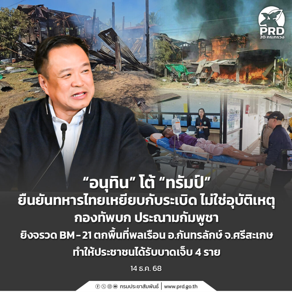 จากกรณีที่ นายโดนัลด์ ทรัมป์ ประธานาธิบดีสหรัฐอเมริกา โพสต์ผ่าน Truth Social ระบุว่า เหตุการณ์ที่ทหารไทยเหยียบกับระเบิดเป็นอุบัติเหตุข้างทาง นายอนุทิน ชาญวีรกูล นายกรัฐมนตรีและรัฐมนตรีว่าการกระทรวงมหาดไทย โพสต์ข้อความ ผ่านเฟซบุ๊กส่วนตัว ระบุว่าไม่ใช่อุบัติเหตุข้างทางแน่นอน ประเทศไทยจะยังคงดําเนินการทางทหารต่อไปจนกว่าเราจะไม่มีอันตรายและคุกคามต่อแผ่นดินและผู้คนของเราอีกต่อไป อยากทําให้มันชัดเจน