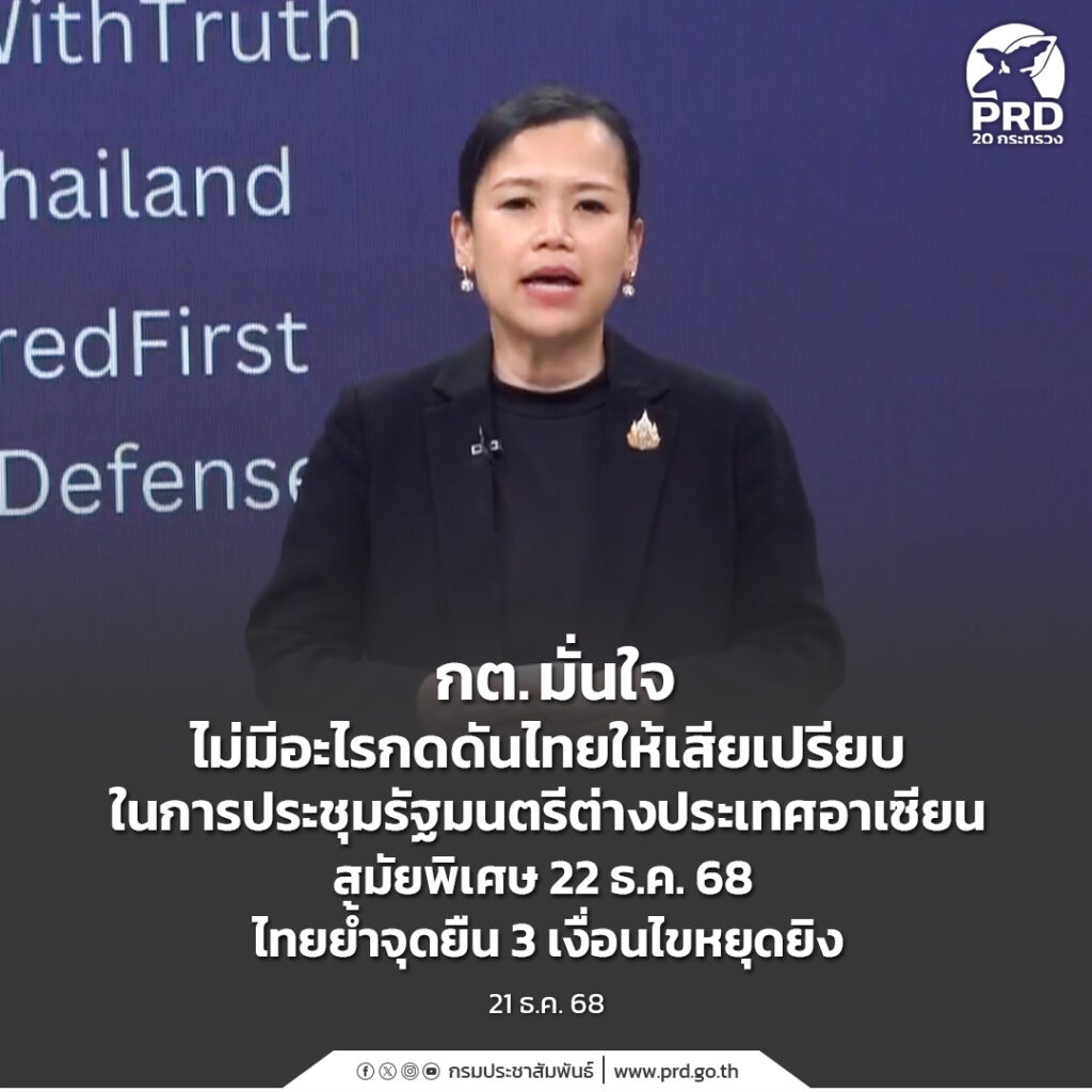 กต. มั่นใจไม่มีอะไรกดดันไทยให้เสียเปรียบในการประชุมรัฐมนตรีต่างประเทศอาเซียน สมัยพิเศษ 22 ธ.ค. 68 ไทยย้ำจุดยืน 3 เงื่อนไขหยุดยิง