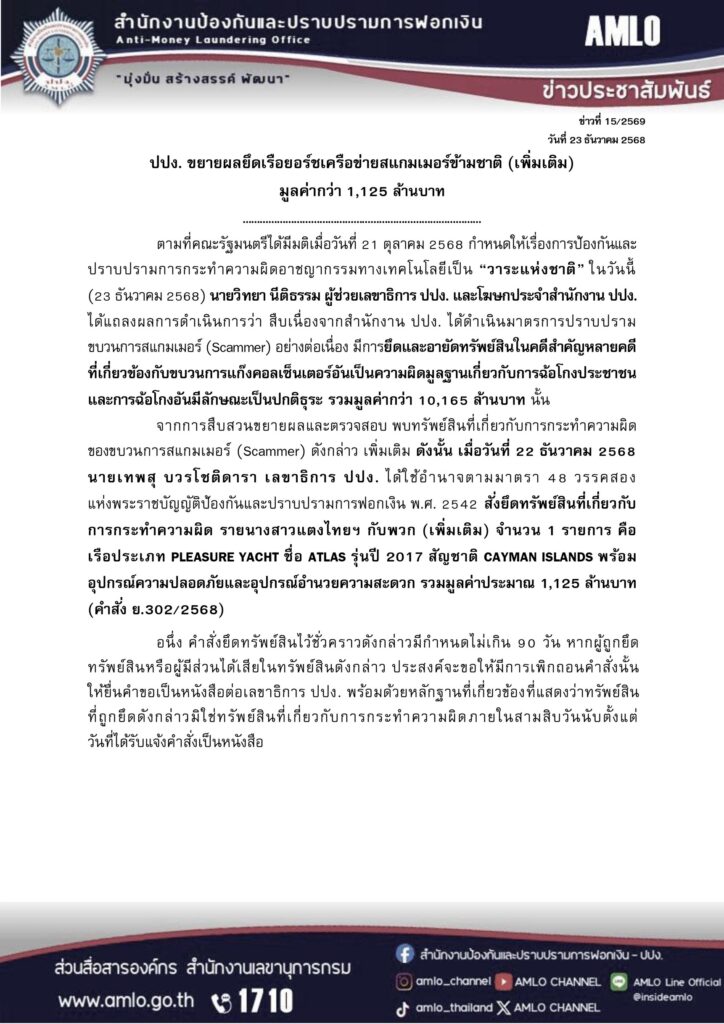 จากการสืบสวนขยายผลและตรวจสอบ พบทรัพย์สินที่เกี่ยวกับการกระทำความผิดของขบวนการสแกมเมอร์ (Scammer) ดังกล่าว เพิ่มเติม ดังนั้น เมื่อวันที่ 22 ธันวาคม 2568 นายเทพสุ บวรโชติดารา เลขาธิการ ปปง. ได้ใช้อำนาจตามมาตรา 48 วรรคสอง แห่งพระราชบัญญัติป้องกันและปราบปรามการฟอกเงิน พ.ศ. 2542 สั่งยึดทรัพย์สินที่เกี่ยวกับการกระทำความผิด รายนางสาวแตงไทยฯ กับพวก (เพิ่มเติม) จำนวน 1 รายการ คือ เรือประเภท PLEASURE YACHT ชื่อ ATLAS รุ่นปี 2017 สัญชาติ CAYMAN ISLANDS พร้อมอุปกรณ์ความปลอดภัยและอุปกรณ์อำนวยความสะดวก รวมมูลค่าประมาณ 1,125 ล้านบาท (คำสั่ง ย.302/2568)