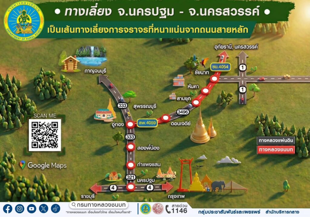 ทั้งนี้ มีการติดตั้งป้ายแนะนำเส้นทางเลี่ยงบนโครงข่ายทางหลวงชนบท เพื่ออำนวยความสะดวกและเพิ่มความคล่องตัวในการเดินทางของประชาชน และหากต้องการความช่วยเหลือหรือสอบถามข้อมูลเพิ่มเติม สามารถติดต่อเจ้าหน้าที่แขวงทางหลวงชนบทในพื้นที่ หรือสายด่วน ทช. โทร 1146