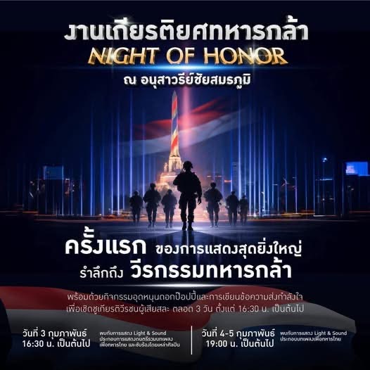 ค่ำคืนแห่งการสดุดี “วีรกรรมทหารกล้า” ครั้งแรกของการแสดงสุดยิ่งใหญ่ เพื่อรำลึกถึงความเสียสละของผู้ที่ยืนหยัดปกป้องแผ่นดินไทย ด้วยหัวใจ ความกล้า และศักดิ์ศรีของนักรบ ณ อนุสาวรีย์ชัยสมรภูมิ 3–5 กุมภาพันธ์ ตั้งแต่เวลา 16.30 น. เป็นต้นไป