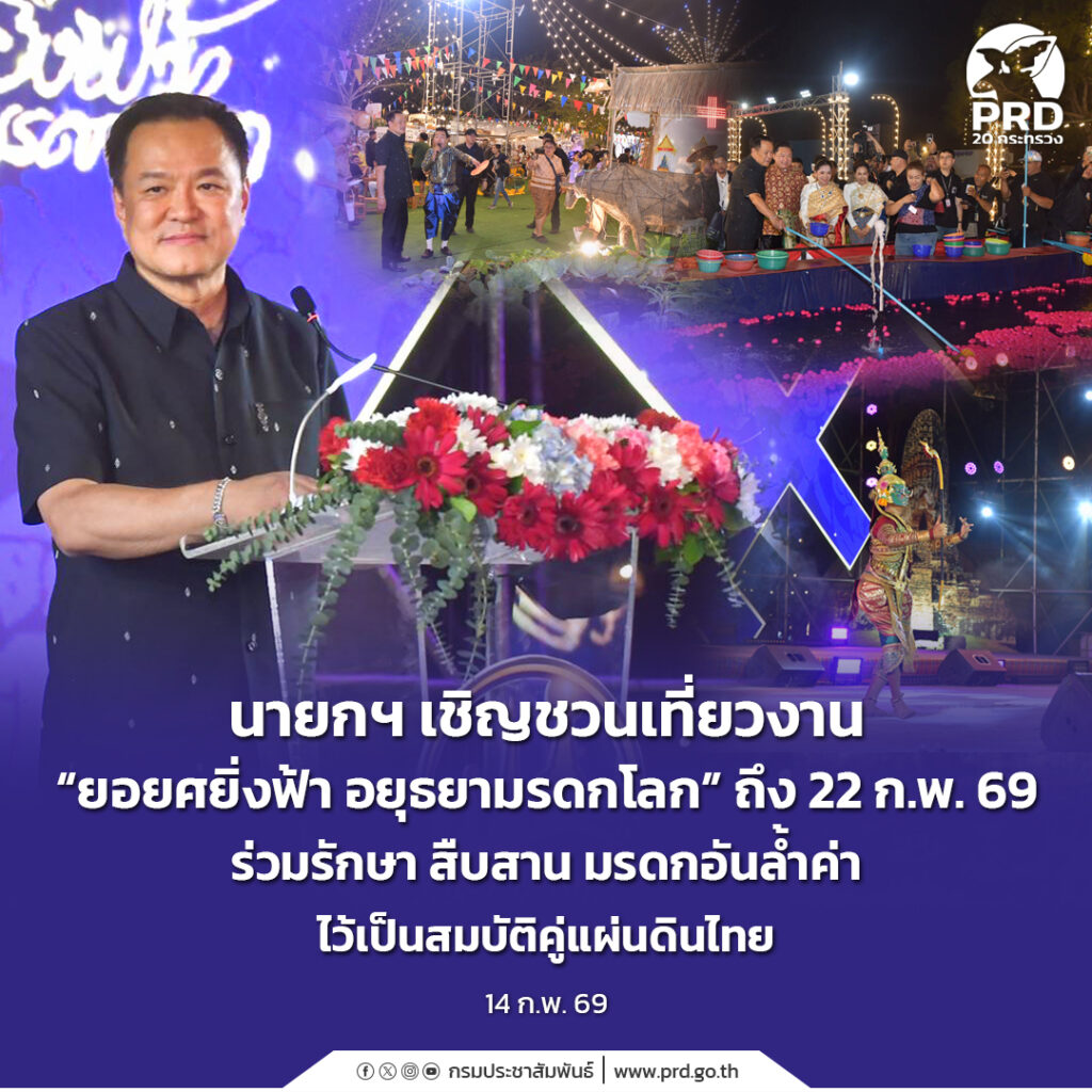 นายกฯ เชิญชวนเที่ยวงาน “ยอยศยิ่งฟ้า อยุธยามรดกโลก” ถึง 22 ก.พ. 69 ร่วมรักษา สืบสาน มรดกอันล้ำค่าไว้เป็นสมบัติคู่แผ่นดินไทย