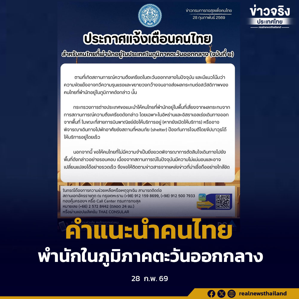 ตามที่เกิดสถานการณ์ความตึงเครียดในตะวันออกกลางในปัจจุบัน และมีแนวโน้มว่าความขัดแย้งอาจทวีความรุนแรงและขยายวงกว้างจนอาจส่งผลกระทบต่อสวัสดิภาพของคนไทยที่พำนักอยู่ในภูมิภาคดังกล่าว