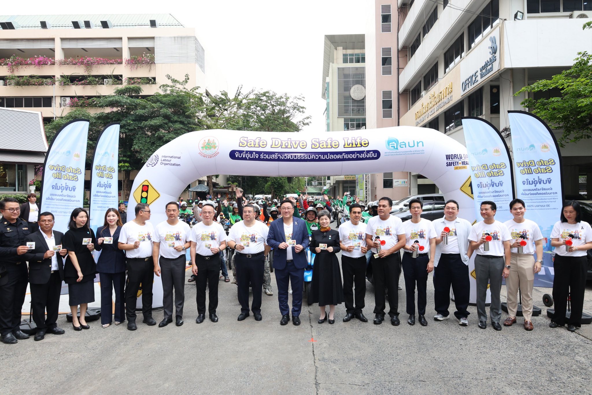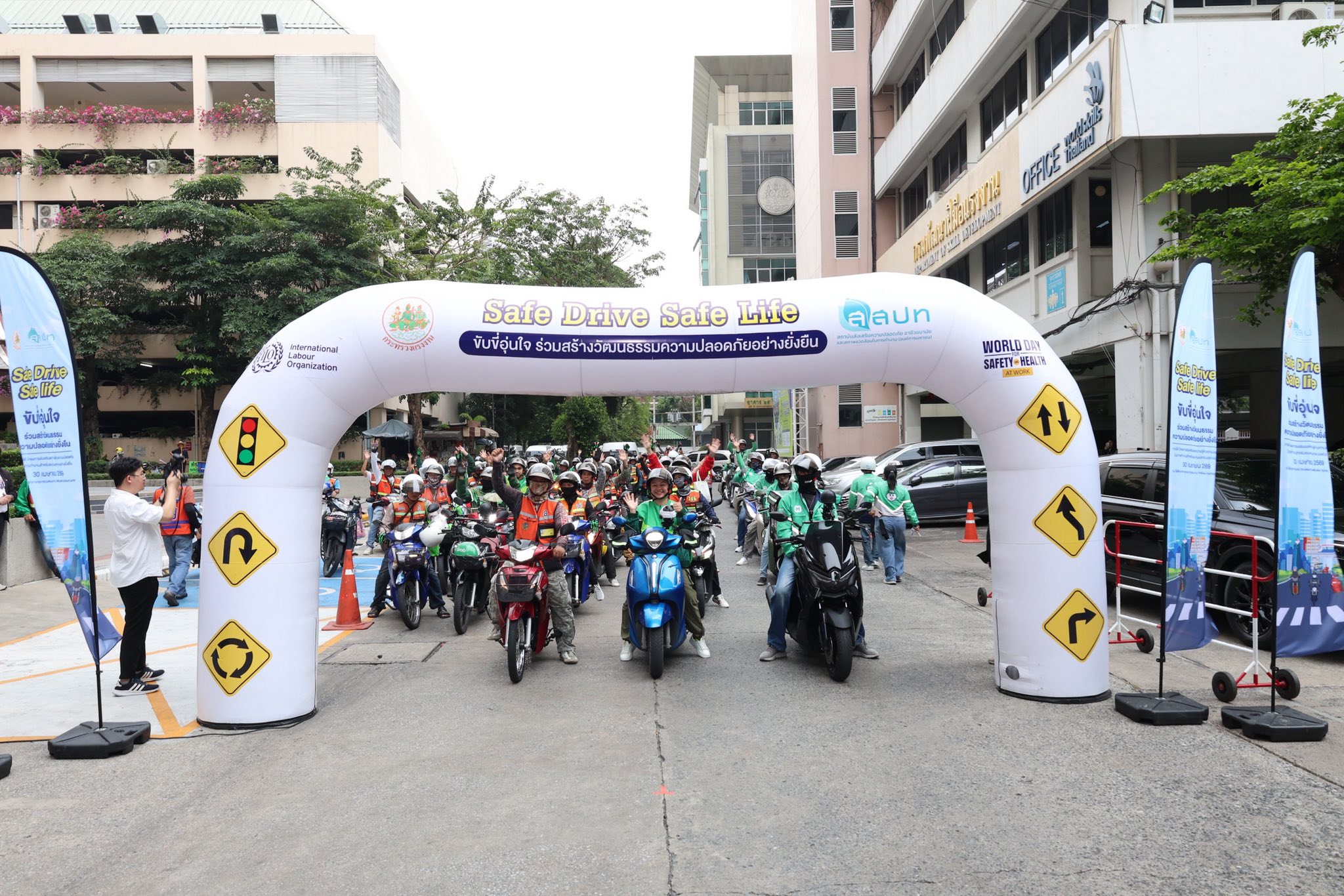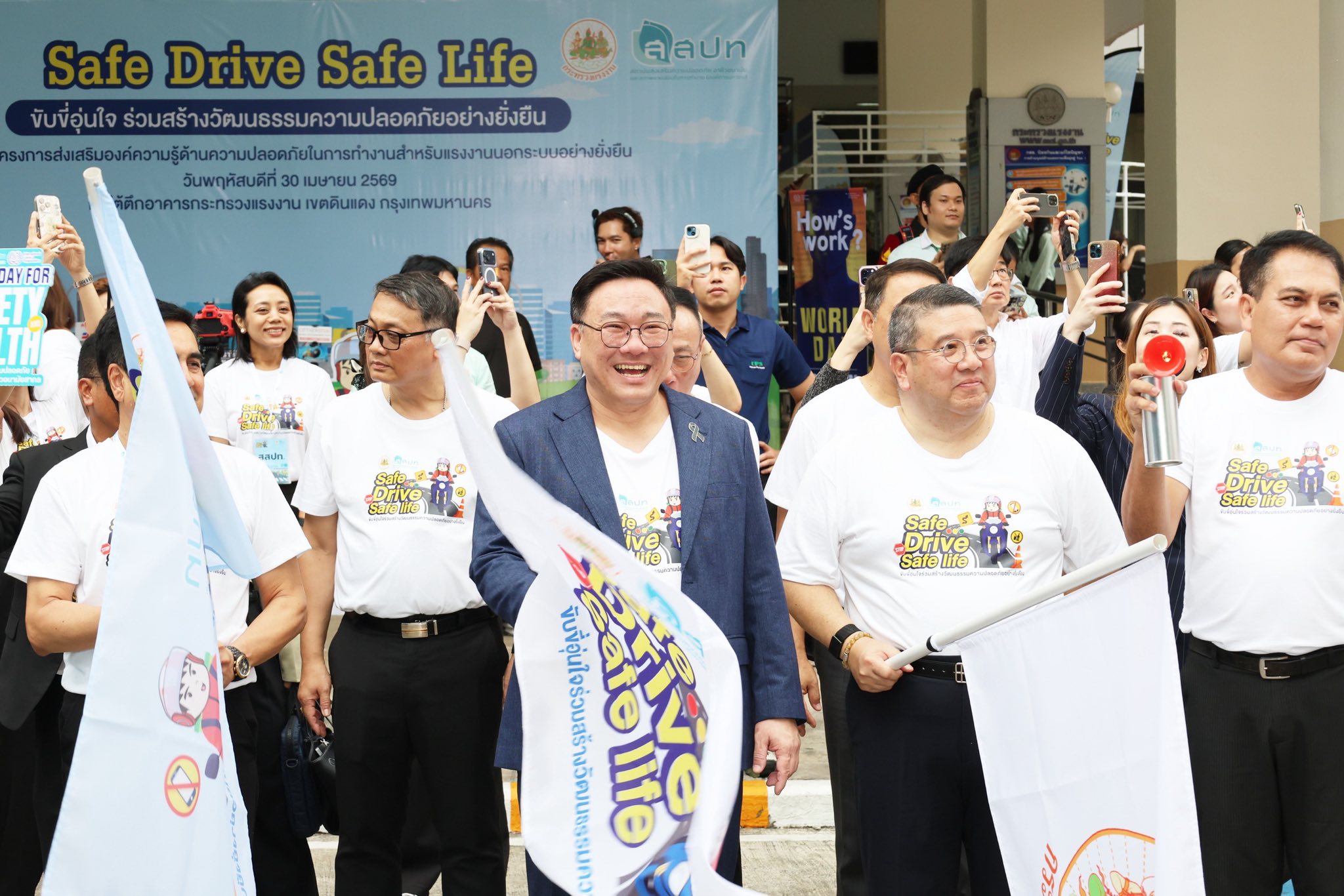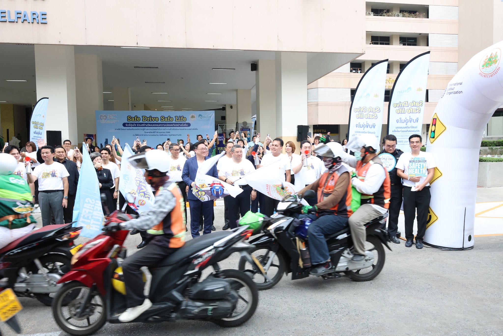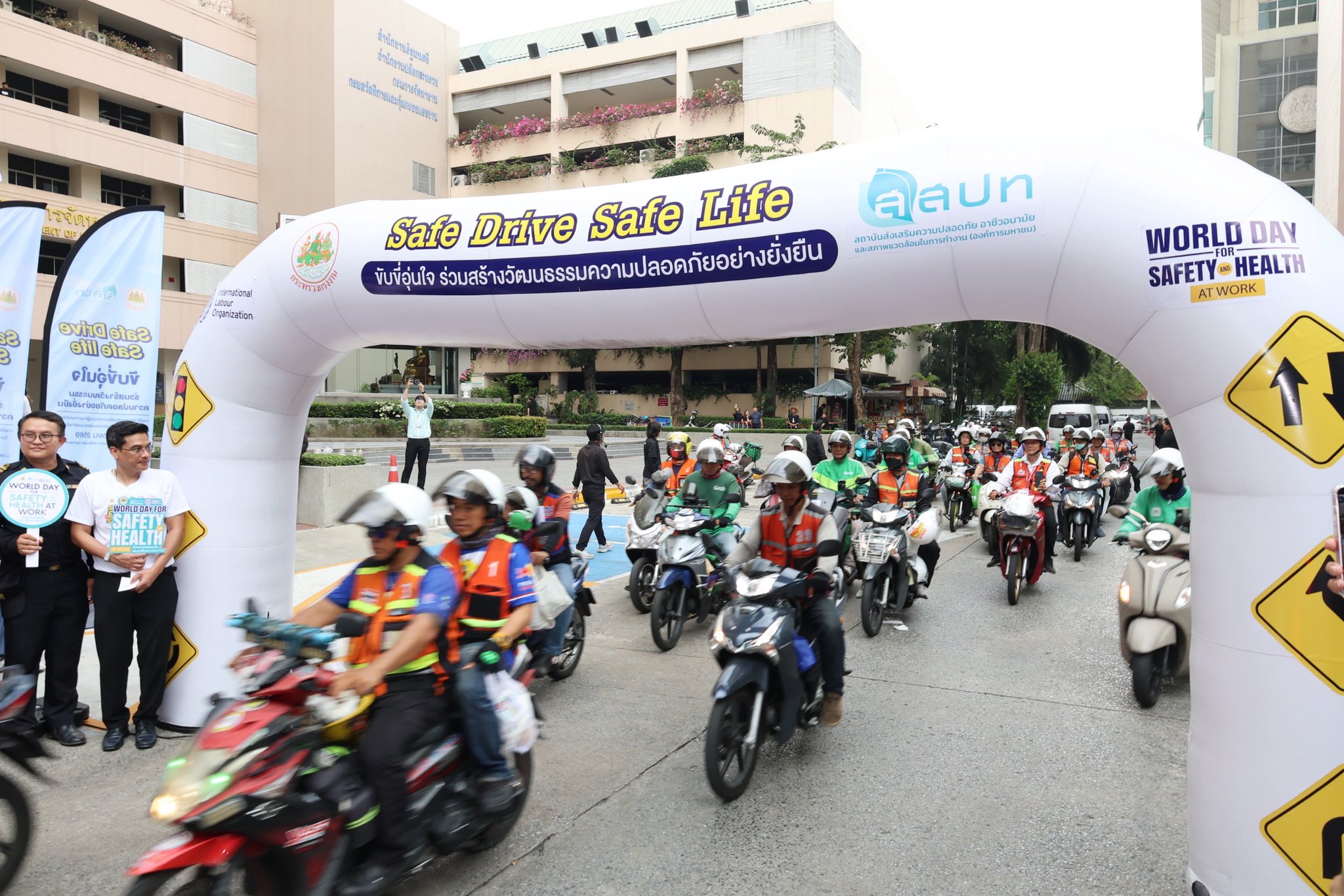 กระทรวงแรงงาน โดยสถาบันส่งเสริมความปลอดภัย อาชีวอนามัย และสภาพแวดล้อมในการทำงาน (สสปท.) จัดกิจกรรม “Safe Drive Safe Life: ขับขี่อุ่นใจ ร่วมสร้างวัฒนธรรมความปลอดภัยอย่างยั่งยืน” เพื่อรณรงค์และยกระดับความปลอดภัยให้กับแรงงานนอกระบบกลุ่มผู้ขับขี่รถจักรยานยนต์สาธารณะและไรเดอร์ขนส่งอาหาร ซึ่งกิจกรรมนี้ได้จัดขึ้นในช่วงวันสำคัญ ในการรณรงค์ด้านความปลอดภัยของโลกและประเทศไทย โดยวันที่ 28 เม.ย. ของทุกปีเป็น World Day for Safety and Health at Work ซึ่งมุ่งเน้นการสร้างวัฒนธรรมความปลอดภัยในการทำงานทั่วโลก ขณะที่ประเทศไทยกำหนดให้วันที่ 10 พ.ค. เป็นวันความปลอดภัยในการทำงานแห่งชาติ เพื่อย้ำเตือนทุกภาคส่วนให้ตระหนักถึงความสำคัญของการป้องกันอุบัติเหตุและการสูญเสียจากการทำงาน กิจกรรม “Safe Drive Safe Life” จึงถือเป็นส่วนหนึ่งของการขับเคลื่อนเชิงรุกที่เชื่อมโยงนโยบายระดับสากลสู่การปฏิบัติในระดับพื้นที่อย่างเป็นรูปธรรม