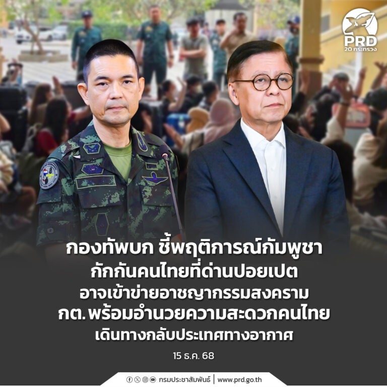 กองทัพบก ชี้พฤติการณ์กัมพูชากักกันคนไทยที่ด่านปอยเปต อาจเข้าข่ายอาชญากรรมสงคราม กต. พร้อมอำนวยความสะดวกคนไทยเดินทางกลับประเทศทางอากาศ 15 ธันวาคม 2025 อ่านต่อ ...