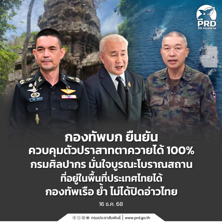 กองทัพบก ยืนยันควบคุมตัวปราสาทตาควายได้ 100% กรมศิลปากร มั่นใจบูรณะโบราณสถานที่อยู่ในพื้นที่ประเทศไทยได้ กองทัพเรือ ย้ำ ไม่ได้ปิดอ่าวไทย 16 ธันวาคม 2025 อ่านต่อ ...