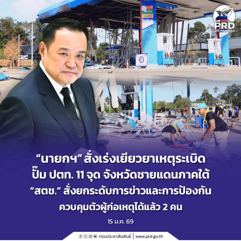 “นายกฯ” สั่งเร่งเยียวยาเหตุระเบิดปั๊ม ปตท. 11 จุด จังหวัดชายแดนภาคใต้ “สตช.” สั่งยกระดับการข่าวและการป้องกัน ควบคุมตัวผู้ก่อเหตุได้แล้ว 2 คน 15 มกราคม 2026 อ่านต่อ ...