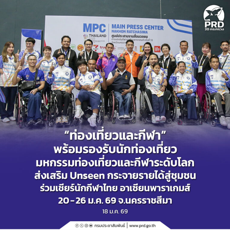 “ท่องเที่ยวและกีฬา” พร้อมรองรับนักท่องเที่ยว มหกรรมท่องเที่ยวและกีฬาระดับโลก ส่งเสริม Unseen กระจายรายได้สู่ชุมชน ร่วมเชียร์นักกีฬาไทย อาเซียนพาราเกมส์ 20–26 ม.ค. 69 จ.นครราชสีมา 18 มกราคม 2026 อ่านต่อ ...