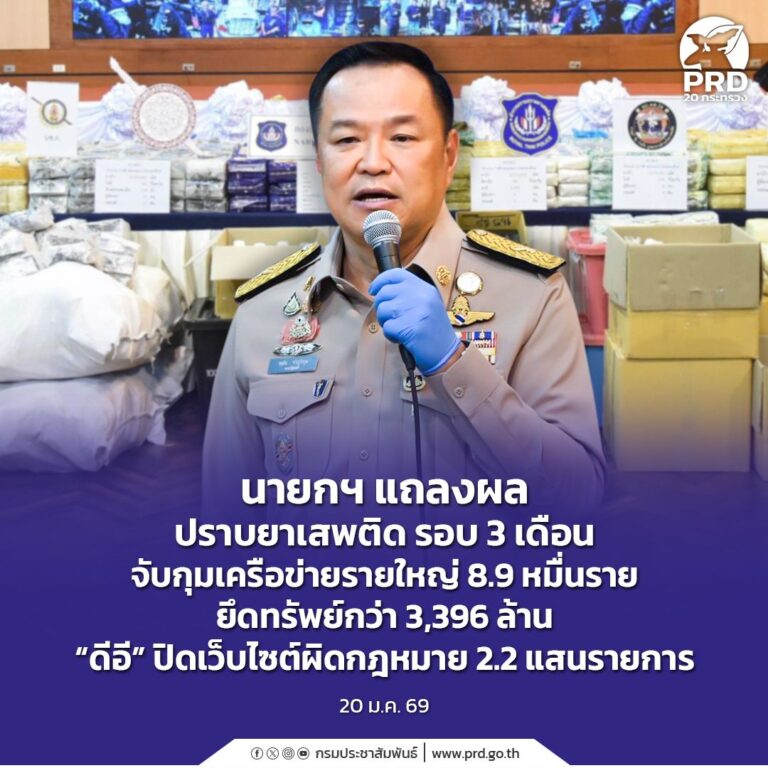 นายกฯ แถลงผลปราบยาเสพติด รอบ 3 เดือน จับกุมเครือข่ายรายใหญ่ 8.9 หมื่นราย ยึดทรัพย์กว่า 3,396 ล้าน “ดีอี” ปิดเว็บไซต์ผิดกฎหมาย 2.2 แสนรายการ 20 มกราคม 2026 อ่านต่อ ...