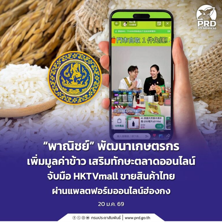 “พาณิชย์” พัฒนาเกษตรกร เพิ่มมูลค่าข้าว เสริมทักษะตลาดออนไลน์ จับมือ HKTVmall ขายสินค้าไทยผ่านแพลตฟอร์มออนไลน์ฮ่องกง 20 มกราคม 2026 อ่านต่อ ...