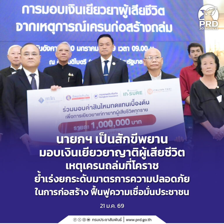 นายกฯ เป็นสักขีพยานมอบเงินเยียวยาญาติผู้เสียชีวิตเหตุเครนถล่มที่โคราช ย้ำเร่งยกระดับมาตรการความปลอดภัยในการก่อสร้าง ฟื้นฟูความเชื่อมั่นประชาชน 21 มกราคม 2026 อ่านต่อ ...