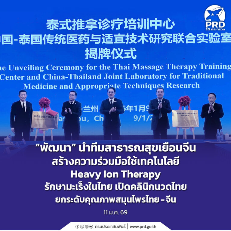 “พัฒนา” นำทีมสาธารณสุขเยือนจีน สร้างความร่วมมือใช้เทคโนโลยี Heavy Ion Therapy รักษามะเร็งในไทย เปิดคลินิกนวดไทย ยกระดับคุณภาพสมุนไพรไทย-จีน 11 มกราคม 2026 อ่านต่อ ...