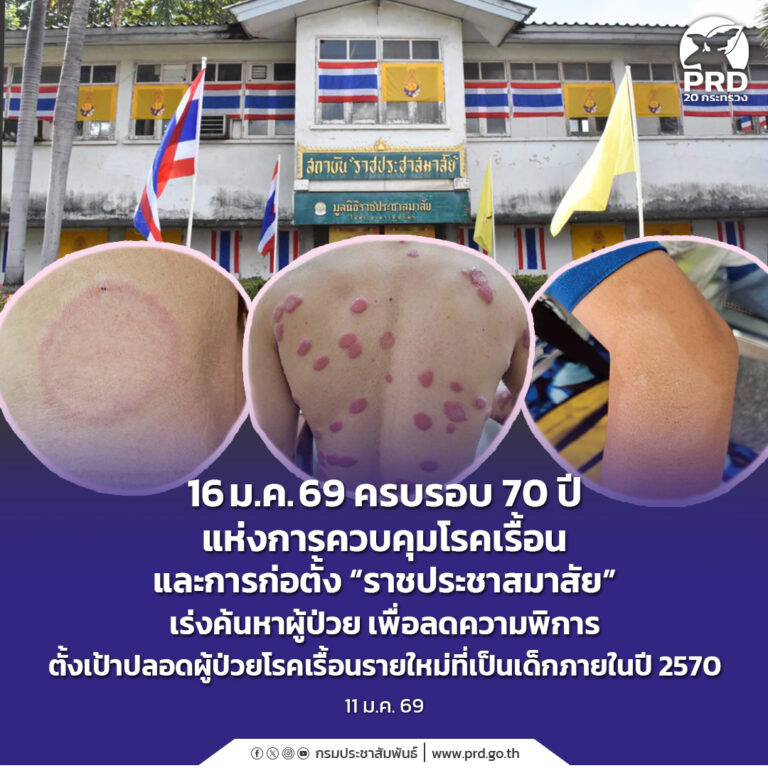 16 ม.ค. 69 ครบรอบ 70 ปี แห่งการควบคุมโรคเรื้อนและการก่อตั้ง “ราชประชาสมาสัย” เร่งค้นหาผู้ป่วย เพื่อลดความพิการ ตั้งเป้าปลอดผู้ป่วยโรคเรื้อนรายใหม่ที่เป็นเด็กภายในปี 2570 11 มกราคม 2026 อ่านต่อ ...