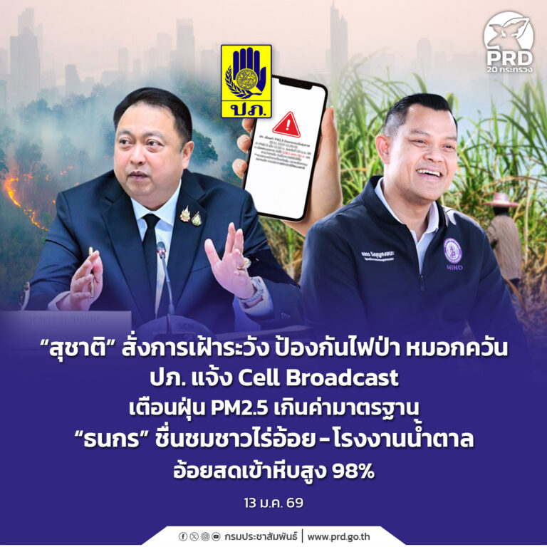 “สุชาติ” สั่งการเฝ้าระวัง ป้องกันไฟป่า หมอกควัน ปภ. แจ้ง Cell Broadcast เตือนฝุ่น PM2.5 เกินค่ามาตรฐาน “ธนกร” ชื่นชมชาวไร่อ้อย-โรงงานน้ำตาล อ้อยสดเข้าหีบสูง 98% 13 มกราคม 2026 อ่านต่อ ...