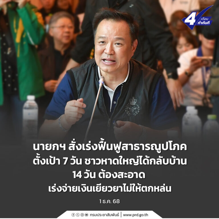 นายกฯ สั่งเร่งฟื้นฟูสาธารณูปโภค ตั้งเป้า 7 วันชาวหาดใหญ่ได้กลับบ้าน 14 วันต้องสะอาดเร่งจ่ายเงินเยียวยาไม่ให้ตกหล่น 1 ธันวาคม 2025 อ่านต่อ ...