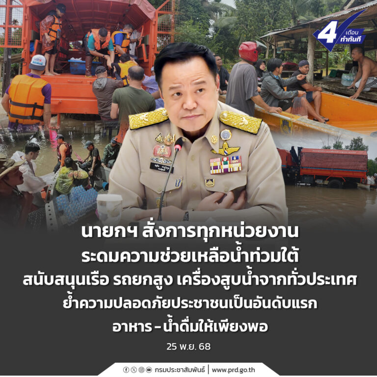 นายกฯ สั่งการทุกหน่วยงานระดมความช่วยเหลือน้ำท่วมใต้ สนับสนุนเรือ รถยกสูง เครื่องสูบน้ำจากทั่วประเทศ ย้ำความปลอดภัยประชาชนเป็นอันดับแรก อาหาร-น้ำดื่มให้เพียงพอ 25 พฤศจิกายน 2025 อ่านต่อ ...