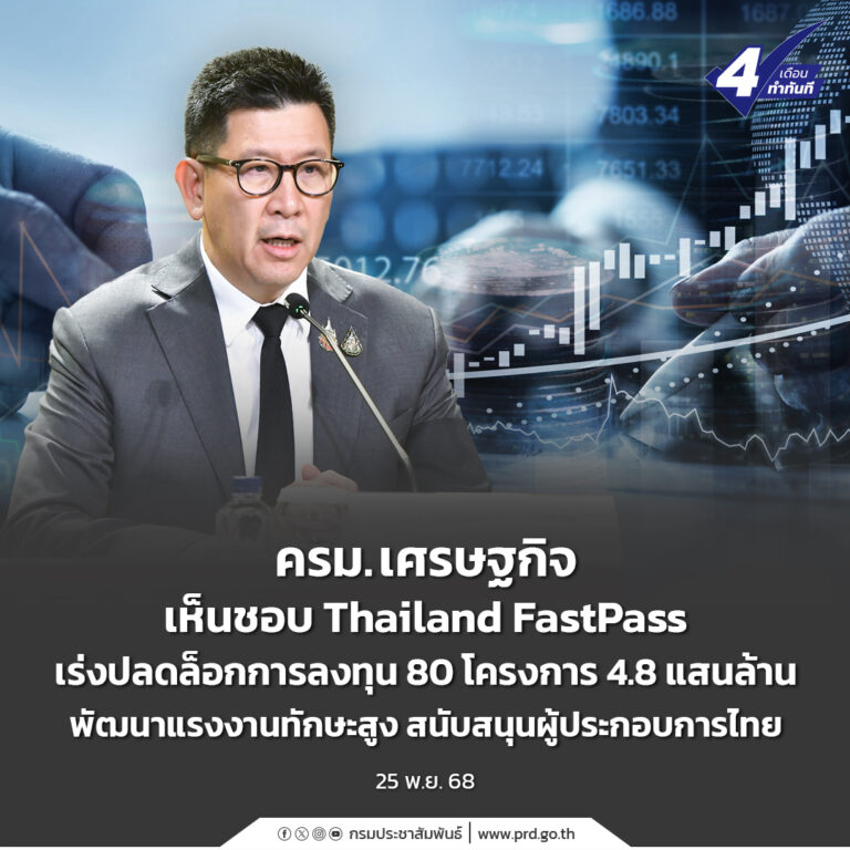ครม.เศรษฐกิจ เห็นชอบ Thailand FastPass เร่งปลดล็อกการลงทุน 80 โครงการ 4.8 แสนล้าน พัฒนาแรงงานทักษะสูง สนับสนุนผู้ประกอบการไทย 25 พฤศจิกายน 2025 อ่านต่อ ...