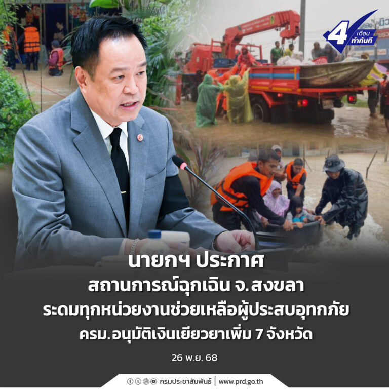 นายกฯ ประกาศสถานการณ์ฉุกเฉิน จ.สงขลา ระดมทุกหน่วยงานช่วยเหลือผู้ประสบอุทกภัย ครม.อนุมัติเงินเยียวยาเพิ่ม 7 จังหวัด 26 พฤศจิกายน 2025 อ่านต่อ ...