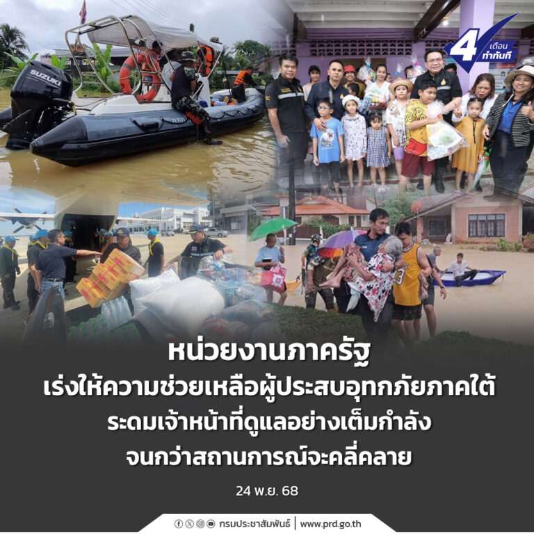 หน่วยงานภาครัฐ เร่งให้ความช่วยเหลือผู้ประสบอุทกภัยภาคใต้ ระดมเจ้าหน้าที่ดูแลอย่างเต็มกำลังจนกว่าสถานการณ์จะคลี่คลาย 24 พฤศจิกายน 2025 อ่านต่อ ...