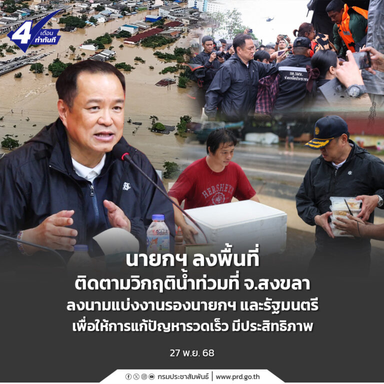 นายกฯ ลงพื้นที่ติดตามวิกฤตน้ำท่วมที่ จ.สงขลา ลงนามแบ่งงานรองนายกฯ และรัฐมนตรี เพื่อให้การแก้ปัญหารวดเร็ว มีประสิทธิภาพ 27 พฤศจิกายน 2025 อ่านต่อ ...