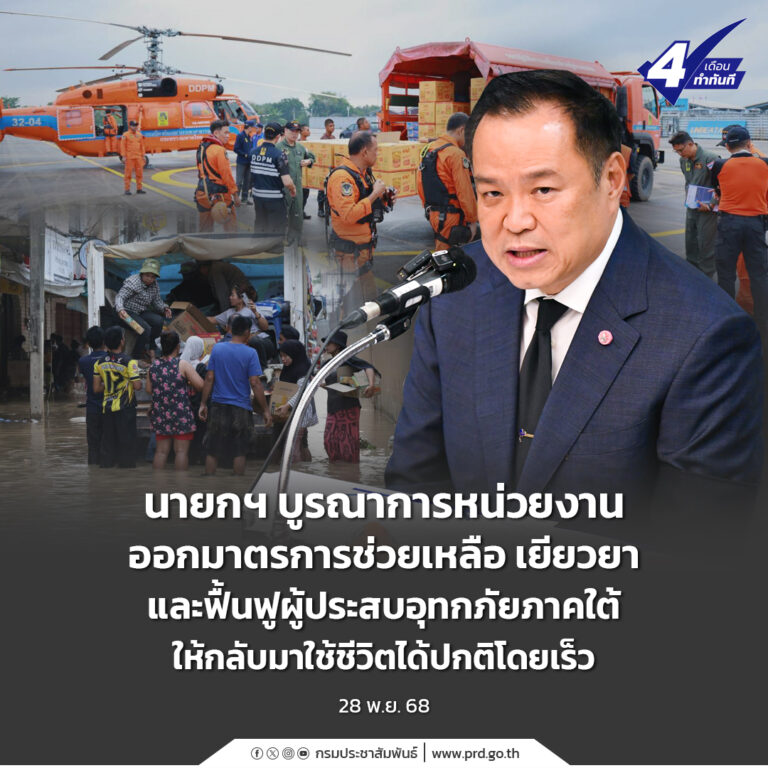 นายกฯ บูรณาการหน่วยงานออกมาตรการช่วยเหลือ เยียวยา และฟื้นฟูผู้ประสบอุทกภัยภาคใต้ให้กลับมาใช้ชีวิตได้ปกติโดยเร็ว 28 พฤศจิกายน 2025 อ่านต่อ ...