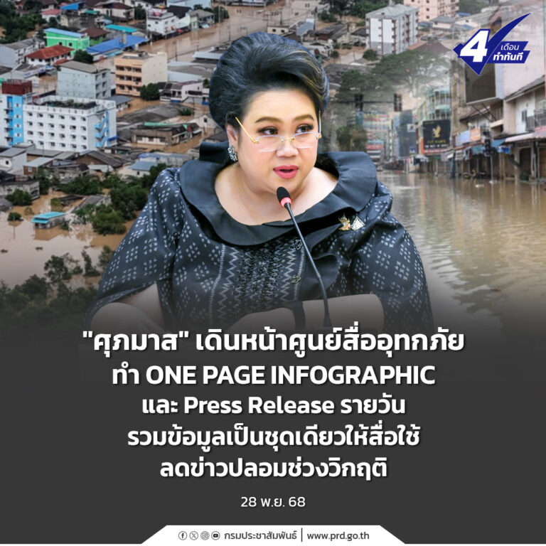 “ศุภมาส” เดินหน้าศูนย์สื่ออุทกภัย ทำ ONE PAGE INFOGRAPHIC และ Press Release รายวัน รวมข้อมูลเป็นชุดเดียวให้สื่อใช้ลดข่าวปลอมช่วงวิกฤต 28 พฤศจิกายน 2025 อ่านต่อ ...