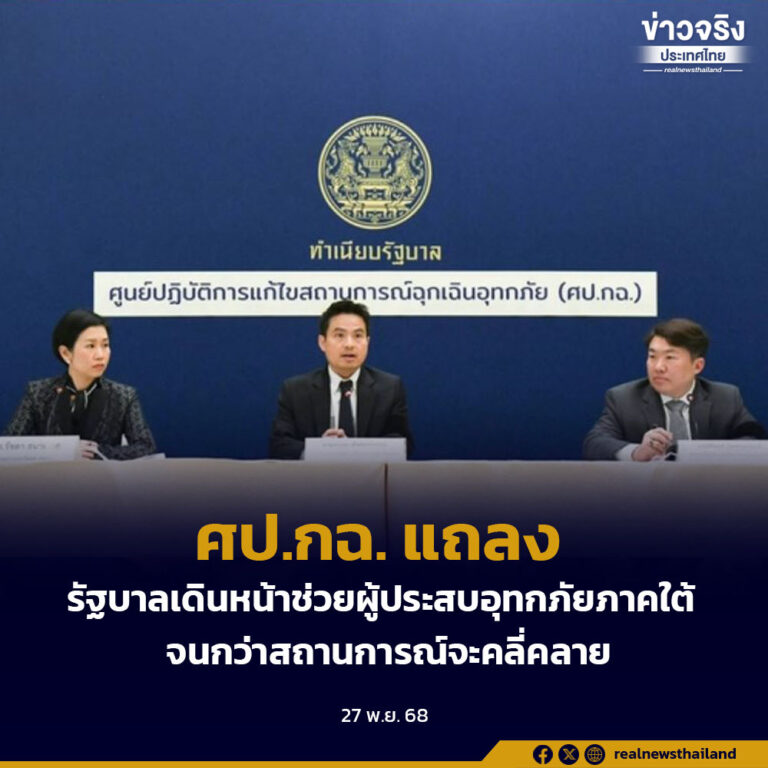 ศป.กฉ. แถลง รัฐบาลเดินหน้าช่วยผู้ประสบอุทกภัยภาคใต้จนกว่าสถานการณ์จะคลี่คลาย 27 พฤศจิกายน 2025 อ่านต่อ ...