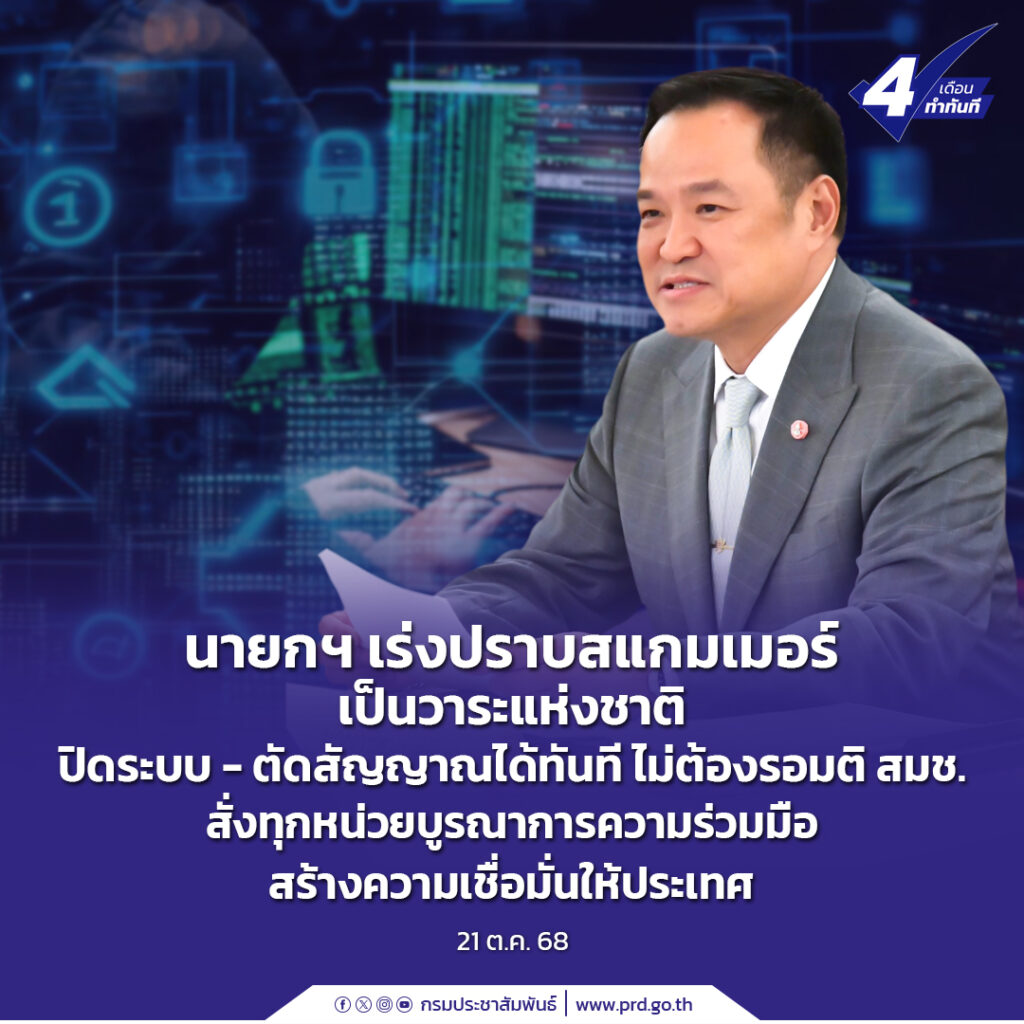 นายกฯ เร่งปราบสแกมเมอร์เป็นวาระแห่งชาติ ปิดระบบ-ตัดสัญญาณได้ทันที ไม่ต้องรอมติ สมช. สั่งทุกหน่วยบูรณาการความร่วมมือ สร้างความเชื่อมั่นให้ประเทศ