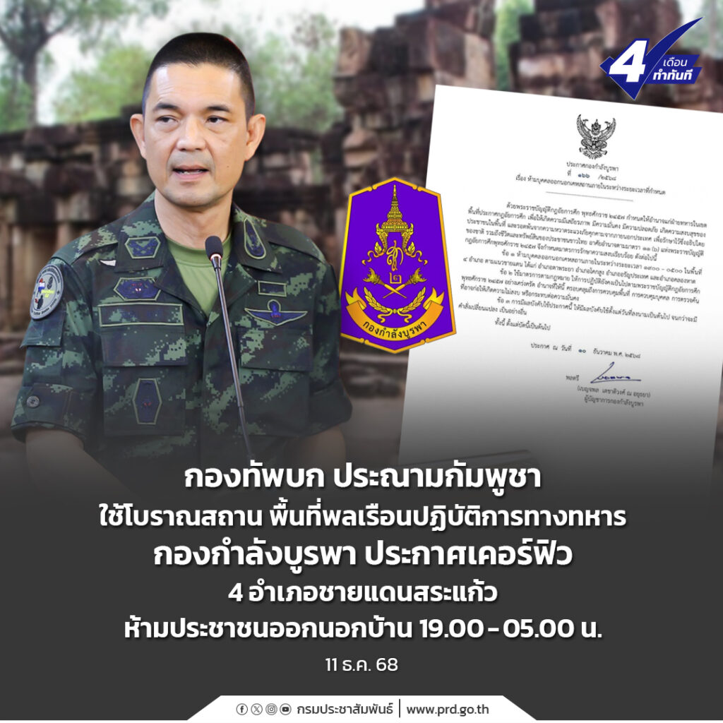 กองทัพบก ประณามกัมพูชา ใช้โบราณสถาน พื้นที่พลเรือนปฏิบัติการทางทหาร กองกำลังบูรพา ประกาศเคอร์ฟิว 4 อำเภอชายแดนสระแก้ว ห้ามประชาชนออกนอกบ้าน 19.00 – 05.00 น.