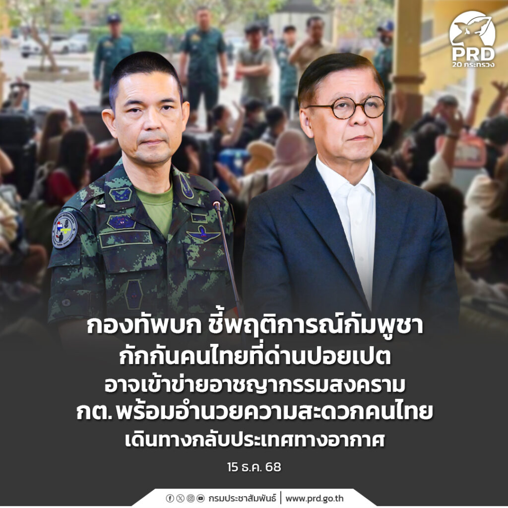 กองทัพบก ชี้พฤติการณ์กัมพูชากักกันคนไทยที่ด่านปอยเปต อาจเข้าข่ายอาชญากรรมสงคราม กต. พร้อมอำนวยความสะดวกคนไทยเดินทางกลับประเทศทางอากาศ
