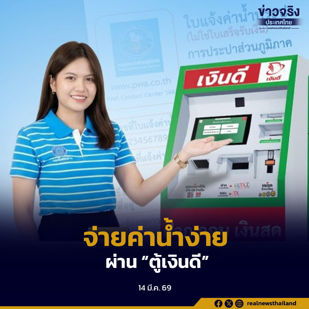 กปภ. เพิ่มช่องทางชำระค่าน้ำผ่าน “ตู้เงินดี” หน้าร้านซีเจ มอร์ ในพื้นที่กรุงเทพฯ ปทุมธานี และชลบุรี จ่ายเงินสดได้ทุกวัน พร้อมโปรโมชันฟรีค่าธรรมเนียมถึง 31 มีนาคม 2569