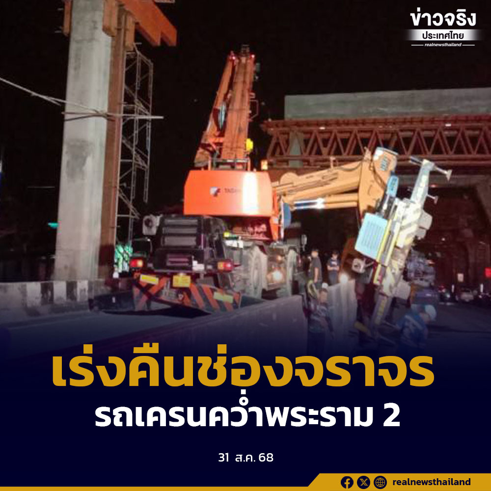 เร่งคืนผิวจราจรช่องทางหลัก เหตุรถเครนพลิกคว่ำบนถนนพระราม 2