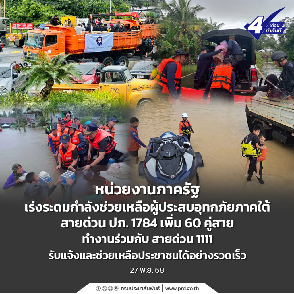หน่วยงานภาครัฐ เร่งระดมกำลังช่วยเหลือผู้ประสบอุทกภัยภาคใต้ สายด่วน ปภ. 1784เพิ่ม 60 คู่สาย ทำงานร่วมกับ สายด่วน 1111 รับแจ้งและช่วยเหลือประชาชนได้อย่างรวดเร็ว