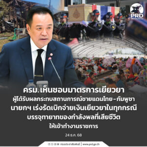 ครม. เห็นชอบมาตรการเยียวยาผู้ได้รับผลกระทบสถานการณ์ชายแดนไทย-กัมพูชา นายกฯ เร่งรัดเบิกจ่ายเงินเยียวยาในทุกกรณี บรรจุทายาทของกำลังพลที่เสียชีวิตให้เข้าทำงานราชการ อ่านเพิ่มเติม » 24 ธันวาคม 2025 ไม่มีความเห็น